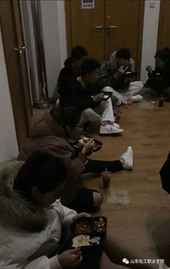 没有充足的就餐环境,学生上台前席地而坐吃晚饭