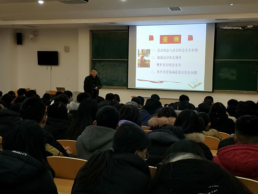 12月28日晚上,学院开展意识形态教育专题讲座。学院党委宣传部部长尹起浩主讲,2017、2018级近200名学生聆听了讲座。