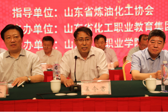 山东省教育厅职业教育处二级调研员孟令君发表讲话。他说,山东化工职业学院牵头成立山东省化工职业教育集团,以服务“绿色化工产业”为明确宗旨和目标,面向山东省新旧动能转换重大工程,提升高端化工人才培养层次和水平,着力进行资源整合,推动行业企业、职业院校的优势互补、互惠互利、共同发展。集团的成立,将为我省化工领域职业教育增添新的力量。希望化工教育集团一是要提高站位,抢抓机遇。深刻理解和把握习近平总书记对现代职业教育改革与发展的重要批示,把深入推进集团化办学作为重要方向。要抓住山东省新旧动能转换重大工程的历史机遇,切实发挥化工职教集团服务全省高端石化产业发展的重要作用,推动化工行业提质增效和转型发展、高质量发展,为打造“化工强省”做出实实在在的贡献。二要积极引领,高效运作。山东化工职业学院作为职教集团的牵头单位要发挥资源优势、专业优势和行业优势,加强统筹协调,提高谋划能力,调动化工行业企业积极参与集团活动。集团理事会要不断完善治理结构和运行机制,促进校企、校校全面合作,积极探索产教融合、“工学一体化”育人新模式。三要加强协作,发挥效应。山东省炼油化工协会要积极发挥行业指导作用,完善相关配套政策,在政策、措施等方面给予支持,推动职教集团健康发展。集团内龙头企业、职业院校和行业协会等要主动担当作为,推动集团的建设和发展,为山东省职业教育改革发展和区域经济社会发展做出积极贡献。