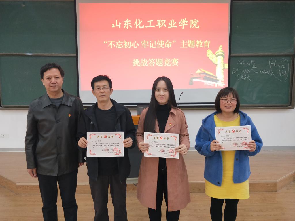 为深入学习贯彻习近平新时代中国特色社会主义思想和党的十九大精神,扎实开展“不忘初心、牢记使命”主题教育,10月31日,山东化工职业学院举行了“不忘初心、牢记使命”主题教育竞赛答题活动,来自全校7个党支部的21名教职工手持手机,在学习强国平台上指尖飞舞,在规定的20分钟时间内,快速抢答题目,最终,基础教学部的李辰老师以最高分脱颖而出获得第一名,基础教学部党支部获得团体第一名。