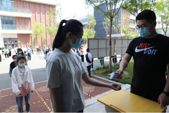 学校门口是疫情防控的第一道关卡,守好校门就是守好开始。演练从学生排队等候进入校园开始。学生戴好口罩,相互间隔1米,排队等候检测体温。