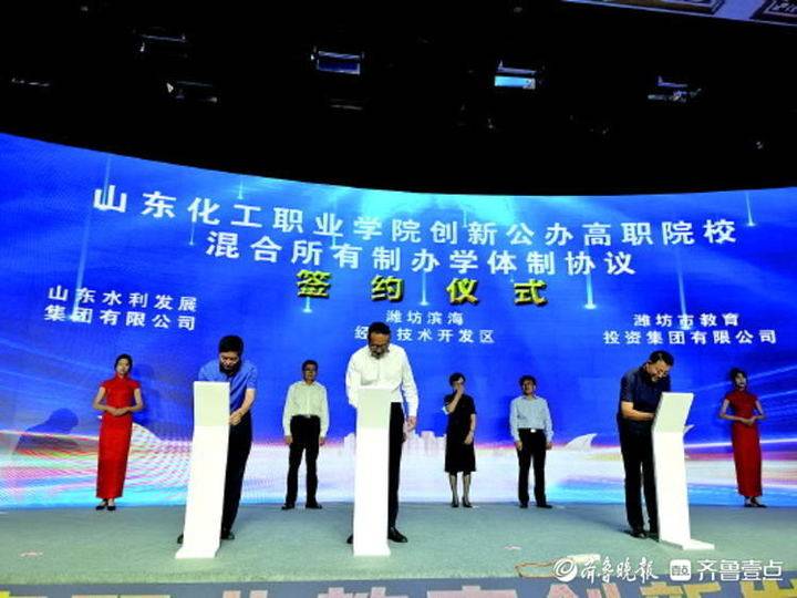 9月25日,在部省共建国家职业教育创新发展高地工作推进会上,潍坊滨海经济技术开发区、山东水利发展集团有限公司、潍坊市教育投资集团有限公司签署山东化工职业学院混合所有制办学协议。山东首个公办高职院校整体混合所有制改革正式启动。