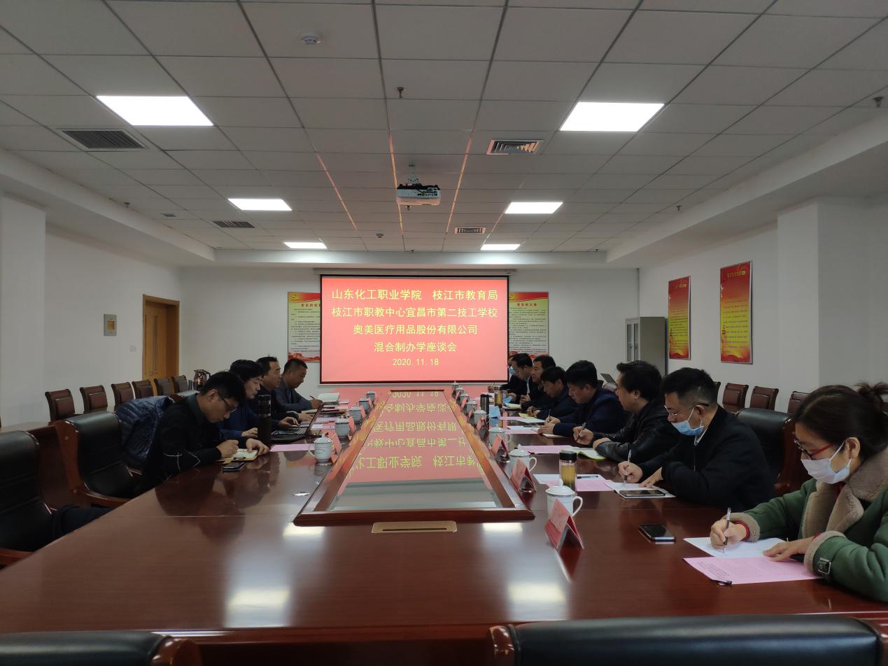 11月18日,湖北省枝江市教育局党委副书记侯玉龙,枝江市职教中心宜昌市第二技工学校校长党委书记袁新宏,奥美医疗用品股份有限公司第一书记郑玉志,奥美医疗用品股份有限公司党委书记、监事会主席彭习云等一行8人赴我校交流混合制办学。学院副院长冯喜成、研究室主任郭素森,水发人力资源管理集团有限公司行政总监查玉锋、教育事业部经理牛纪虎等参加了混合制办学交流座谈会。