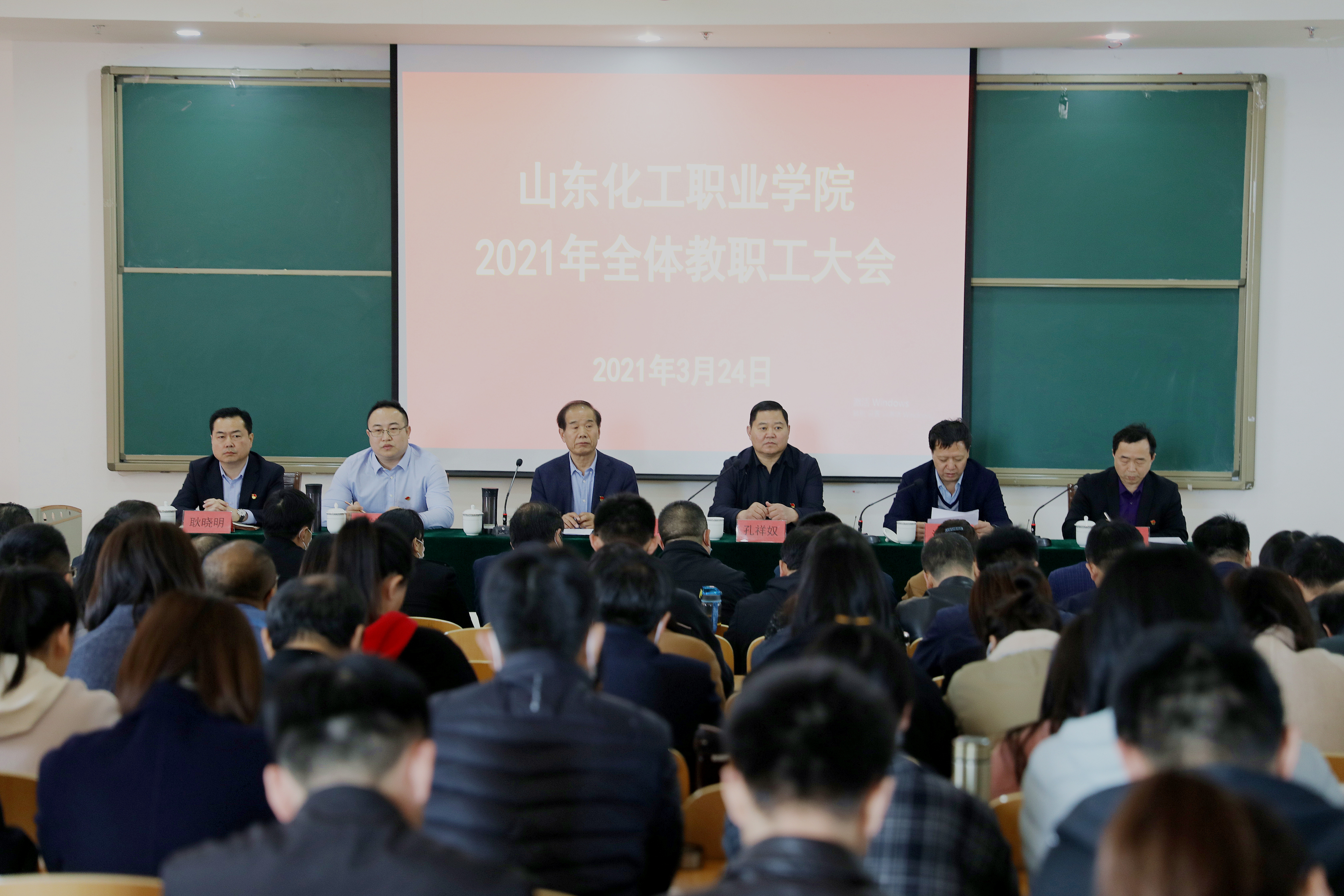 3月24日下午,山东化工职业学院2021年全体教职工大会在8号多媒体教室召开。学院领导王敬良、王钧东、潘慧、耿晓明、冯喜成出席,全体教职工参加。大会由学院党委书记孔祥奴主持。大会进行了三项议程:党委副书记潘慧总结2021年寒假重点工作,副校长冯喜成传达2021年学校工作要点,校长王敬良作重要讲话。