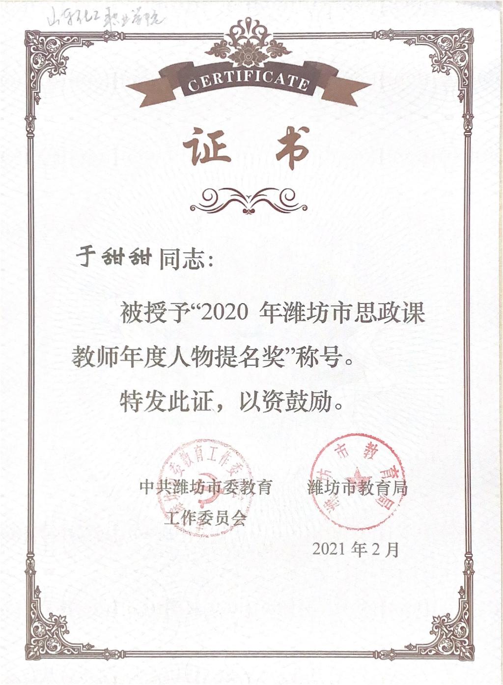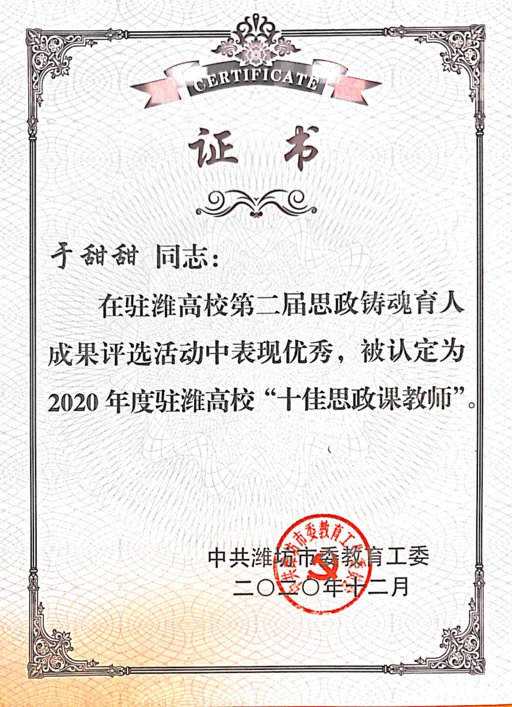 泰戈尔的诗中曾写道:“花的事业是甜蜜的,果的事业是珍贵的,让我干叶的事业吧,因为它总是谦逊地低垂着它的绿荫。”就是带着对绿叶精神的那份追求,和对教育事业的美好憧憬,2017年,于甜甜毕业后走进了山东化工职业学院的大门,成为一名思政教师,负责高职思想政治理论课的授课任务。对待教学,对待课堂,于甜甜无疑是认真的,热爱的。她深知思想政治理论的晦涩枯燥,一味地灌输理论,学生容易产生厌烦情绪,因此于甜甜采用生动诙谐的语言,引用生活化的案例,帮助学生理解理论知识,领悟思政学习的重要性,点燃学生对思政学习的热情和兴趣,提高学生们的思想政治素养。对教学的热爱,对专业的钻研,于甜甜荣获山东省首届学校思政课教学比赛二等奖,山东省第六届高校教师教学比赛三等奖,2020年度驻潍高校“十佳思政课教师”称号,连续3年获得校级“优秀教师”,获得“优秀共产党员”等荣誉称号。