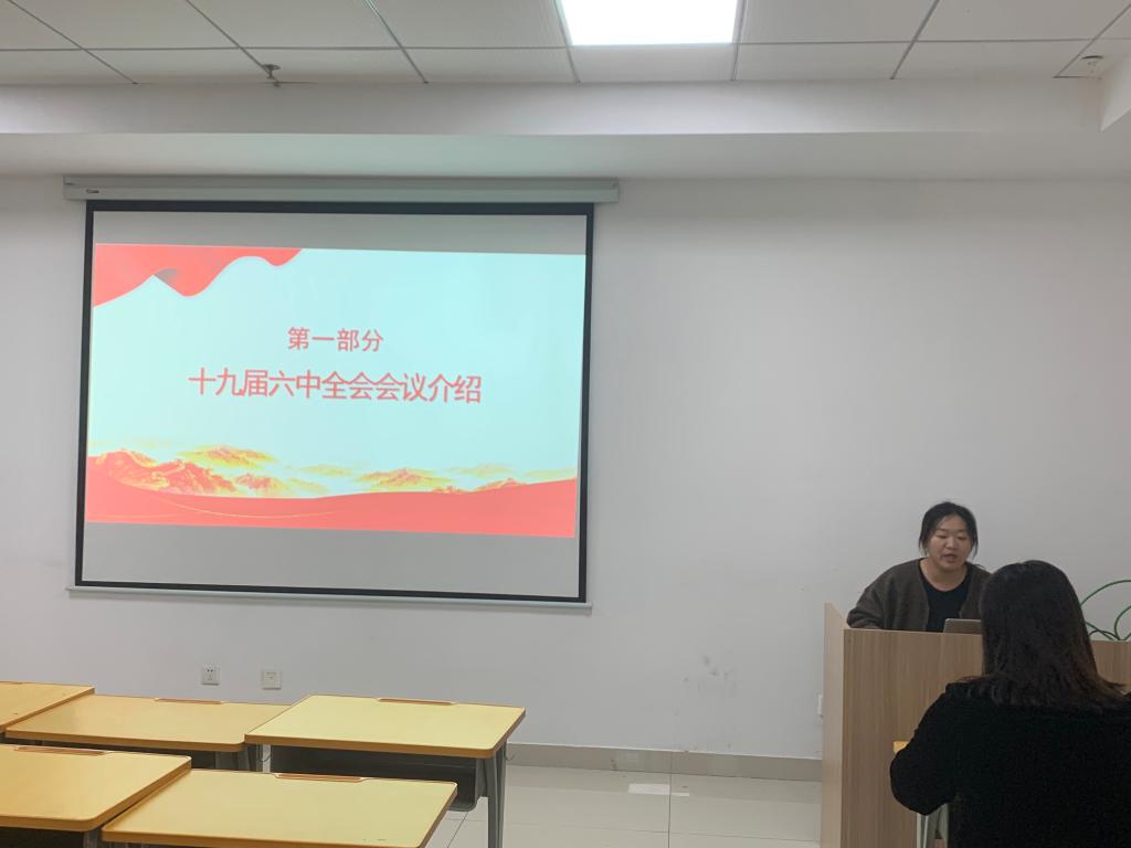 会上,马克思主义学院副院长吴宁霞带领全体党员学习了党的十九届六中全会精神。吴宁霞对十九届六中全会进行了详细的介绍,从为何要总结党的百年奋斗的重大成就和历史经验、中国共产党的百年奋斗历程、伟大历史意义和宝贵经验等方面进行了全面解读。党员们从党的伟大成就和宝贵经验中汲取力量,推动学校的内涵建设和高质量发展。