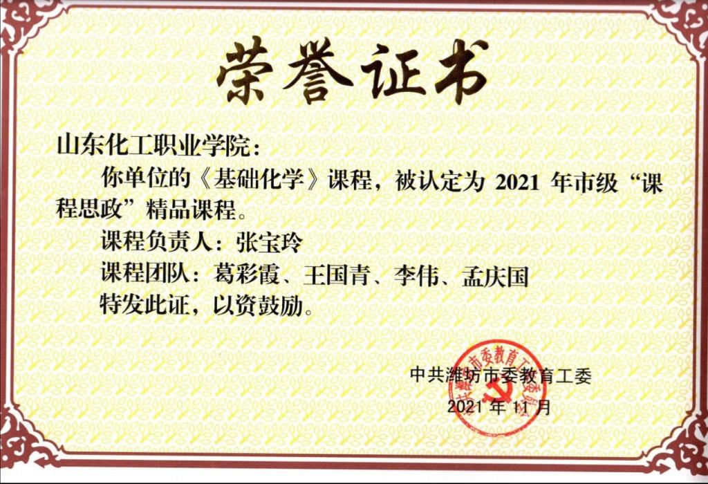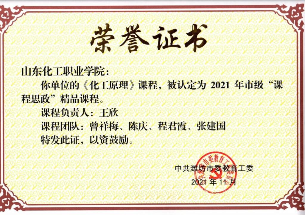 根据《关于做好近期思政有关重点工作的通知》(潍教工委函〔2021〕2号)精神,经各学校评选推荐、潍坊市专家评审、结果公示等环节,确定了71门市级“课程思政”精品课程。其中,我校王欣老师负责的《化工原理》课程、王雅男老师负责的《高分子材料基本合成工艺》课程和张宝玲老师负责的《基础化学》课程成功被认定为市级“课程思政”精品课程。