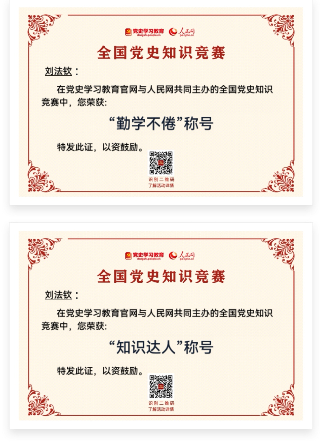 兴趣是学习最好的动力。谈到自己在“学习强国”上取得的优异成绩,刘老师首先归功于自己对于历史等人文社科的浓厚学习兴趣。“学习强国”上的理论、党史、文化、文艺、科学、法治知识为刘老师提供了丰富的学习资源,借助平台上丰富的学习资源和竞赛答题,丰富学习模式,提高了学习兴趣,更加热衷于学习,学习成绩自然名列前茅。2020年11月11日,刘老师在“学习强国”挑战答题创下1600道题全通关的记录。在党史学习教育网和人民网今年主办的党史学习教育知识竞赛中,刘法钦老师坚持学习和答题,成绩优异,荣获“最强大脑”、“百胜将军”“勤学不倦”和“知识达人”等称号。