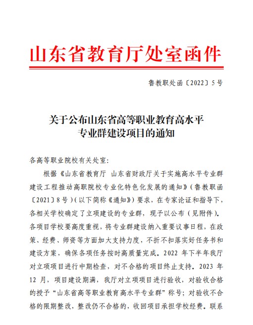 2022 年 2 月 26 日,山东省教育厅公布了山东省高等职业教育高水平专业群建设项目立项名单,山东化工职业学院机电工程学院化工自动化技术专业群列入建设名单。化工自动化技术专业群建设工作是优化学校专业结构和资源配置,推动学校特色发展,实现高质量发展,深入贯彻《国家职业教育改革实施方案》《职业教育提质培优行动计划(2020— 2023)》《教育部山东省人民政府关于整省推进提质培优建设职业教育创新发展高地的意见》的具体行动,也是进一步推动职业教育产教融合、提高职业技能人才培养质量、增强职业院校社会服务能力的重大举措。