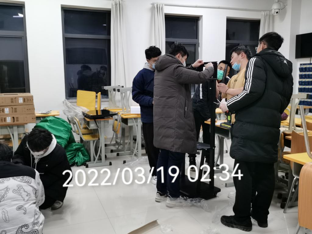 在学校党委的统一领导和部署下,后勤服务中心、信息技术中心和学校计算机社团的7名学生于3月19日凌晨连夜完成了16套测温设备的接运安装调试工作,协助学校实现全方位无遗漏的筛查,为学校的疫情防控工作提供设备和技术支持。