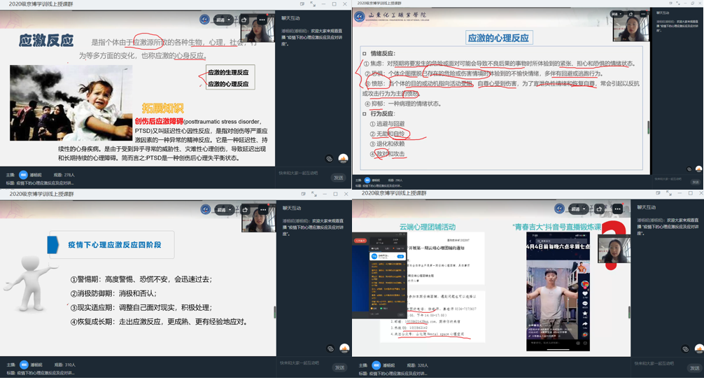 组织教师进行疫情防控心理知识讲座,让学生了解防控知识、疫情发展趋势、我校疫情防控工作,让学生了解我校各项措施的初心,疏导学生的紧张情绪,减轻学生的心理压力,做好心理干预。