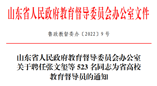 为进一步完善教育督导职能,健全督学工作体系和学校内部督导制度,加强对高校的督导评估评价工作,根据《山东省教育督导条例》《山东省督学管理办法》等有关规定要求,经过学校推荐、组织审核、公开公示等程序,山东省政府教育督导委员会办公室聘任了第一届省高校教育督导员,共523名。我校潘慧副书记、冯喜成副校长、李凤娟处长、殷晓丽副处长等4位领导位列其中。