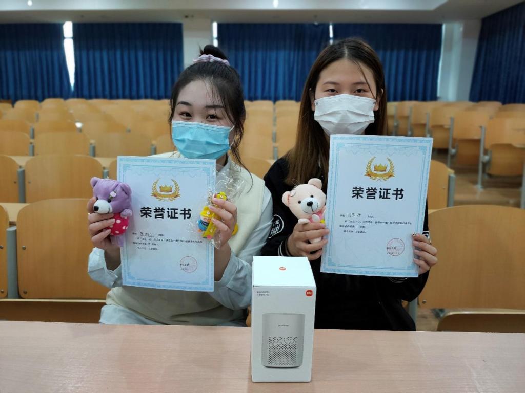5月12号下午4点,我们在第六阶梯教室欢聚一堂,为获奖同学举行了颁奖仪式。心理疏导工作专班组长朱彬彬对活动进行总结发言,同时也对同学们进行了鼓励,并给予厚望。我们还邀请了学生工作处处长陈恒亮、心理疏导工作专班副组长吴宁霞为获奖者进行了颁奖。拿到奖品后同学们乐开了花,在欢声笑语中我们拍照留念。