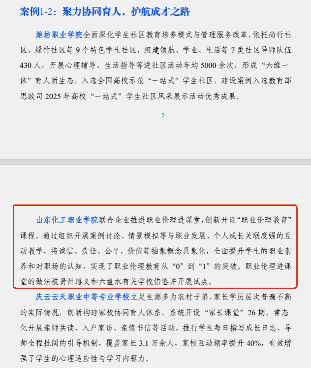 近日,山东省教育厅正式发布《山东省职业教育质量报告(2025年度)》,我院联合企业创新开设“职业伦理教育”课程的典型经验,成功入选“聚力协同育人,护航成才之路”专题案例。