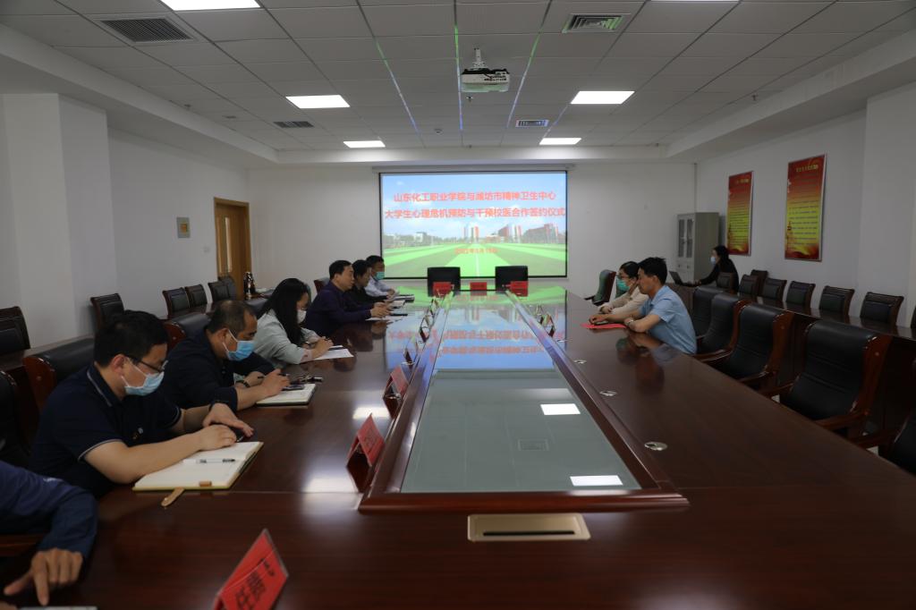 潍坊市精神卫生中心心理咨询中心副主任孟亮亮,心理咨询师崔志霞,我校副校长冯喜成,管理工程学院党支部书记朱彬彬、航空学院党支部书记刘建伟、机电工程学院党支部副书记范兴凯、化学工程学院党支部副书记王恒磊、五年高职学院党支部副书记任腾飞、基础教学部党支部副书记吴宁霞参加本次签订仪式。双方高度重视此次合作,一致表达了对构建社会心理服务体系,提高大学生心理健康水平,医校共建、协同发展的美好期愿。
