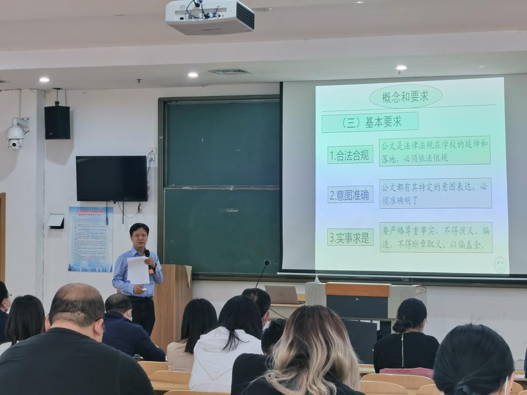学校党委副书记潘慧给大家上了一堂精彩的常见应用文写作培训课,对公文的定义、类别以及基本写作要求做了说明,对几种常见的应用文如何写作进行了细致的讲解,并结合自己的心得,以实例来一一分析,着重指出了公文写作常见问题。有效结合了学校日常公文写作的实际,提高了学生教育管理人员公文写作能力和写作技巧。