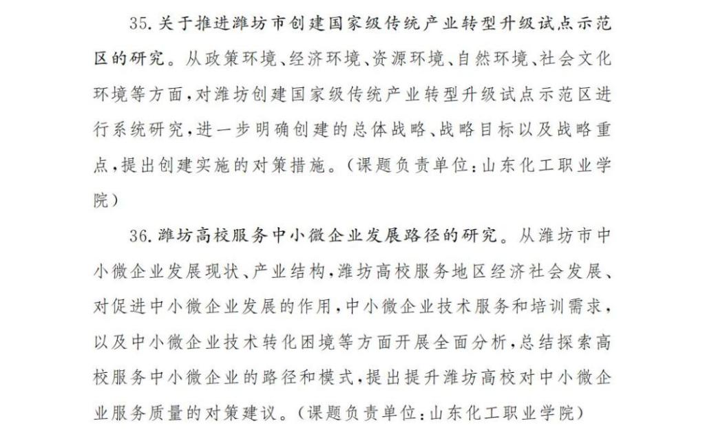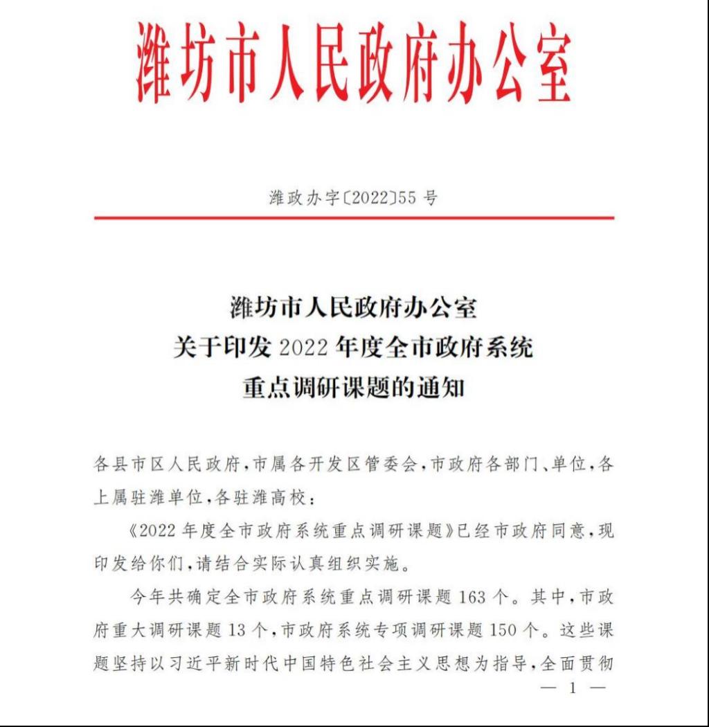 2022年5月17日,潍坊市人民政府办公室发布了《关于印发2022年度全市政府系统重点调研课题的通知》(潍政办字〔2022〕55号),我校2项课题获批立项。分别为,刘凯主持的《关于推进潍坊市创建国家级传统产业转型升级试点示范 区的研究》和吕宜春主持的《潍坊高校服务中小微企业发展路径的研究》。