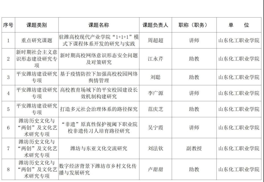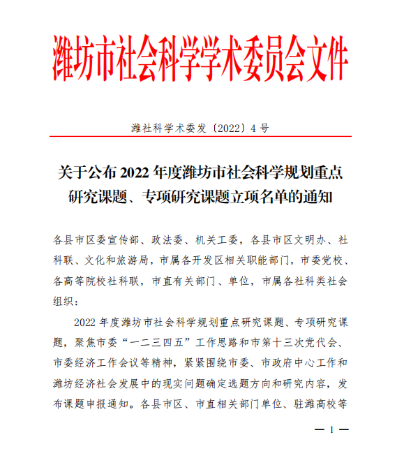 2022年6月6日,潍坊市社会科学学术委员会发布了《关于公布2022年度潍坊市社会科学规划重点研究课题、专项研究课题立项名单的通知》(潍社科学术委发〔2022〕4号),我校8项课题获批立项。分别为,周超超主持的重点研究课题1项,江永芹主持的新时期社会主义意识形态建设研究专项1项,刘聪、李广源、范庆芝主持的平安潍坊建设研究专项3项,吴宁霞、刘法钦、卢甜甜主持的潍坊历史文化与“两创”及文化艺术研究专项3项。