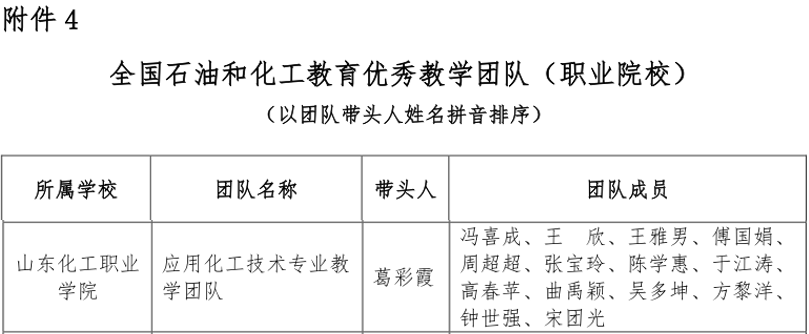 10月12日,中国化工教育协会发布《关于公布2023年全国石油和化工教育教学名师、优秀教学团队、优秀教学管理人员认定结果的通知》(中化教协发〔2023〕49 号),我校应用化工技术专业教学团队获批全国石油和化工教育优秀教学团队。