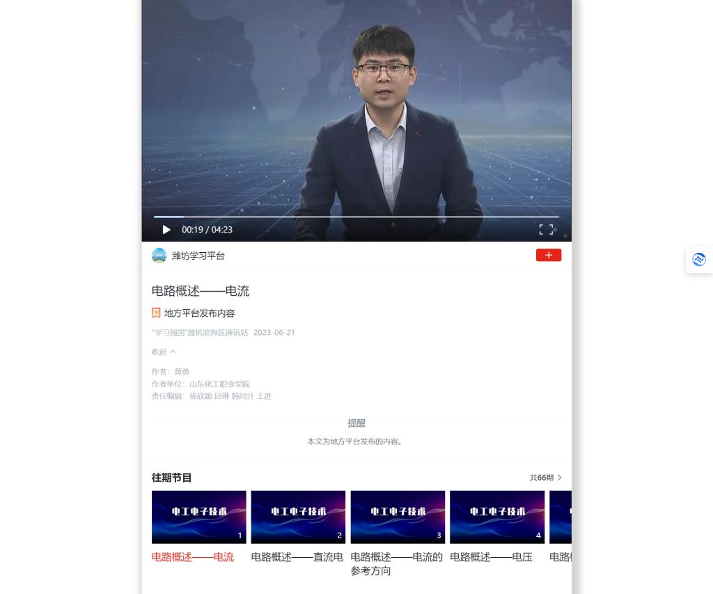 近日,我校机电工程学院黄勇老师录制的《电工电子技术》课程成功上线学习强国平台,迅速成为众多读者观看、学习的一门在线学习资源。学习强国平台是由中共中央宣传部推出的在线学习平台,旨在为广大党员干部和人民群众提供丰富的学习资源。该课程的上线发布,充分展示了课程的思想性、学术性和专业性,是对学校青年教师教学水平和专业能力的认可,也是山东化工职业学院深入学习贯彻习近平新时代中国特色社会主义思想,全面落实立德树人根本任务和实施“三全育人”的又一体现。