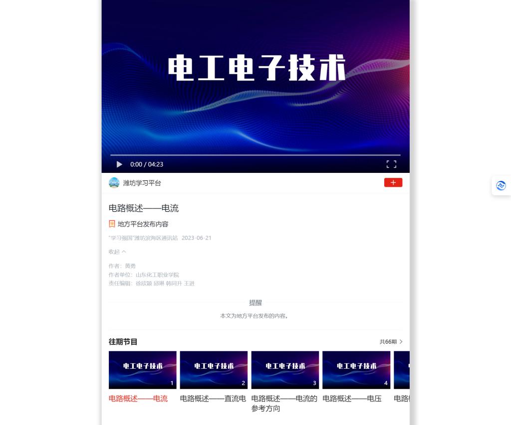 “学习强国”平台《电工电子技术》课程链接:https://article.xuexi.cn/articles/video/index.html?&art_id=12807178280219983272&study_style_id=video_default&cdn=https://region-shandong-resource&study_comment_disable=0&part_id=16053109518422642269&source=share&share_to=dd
