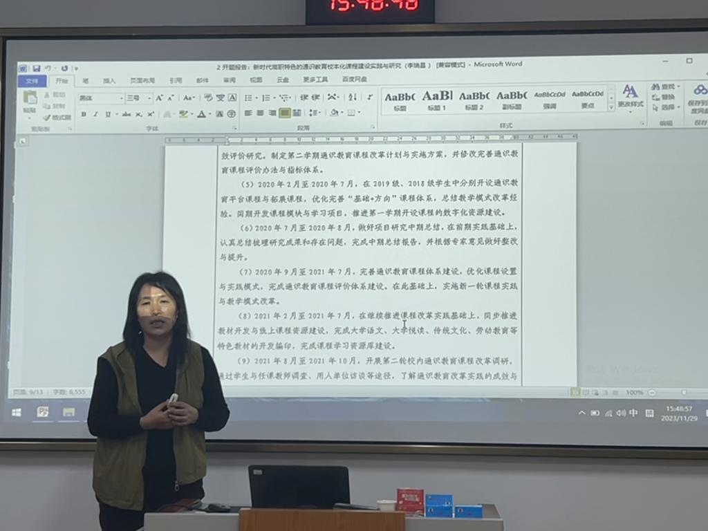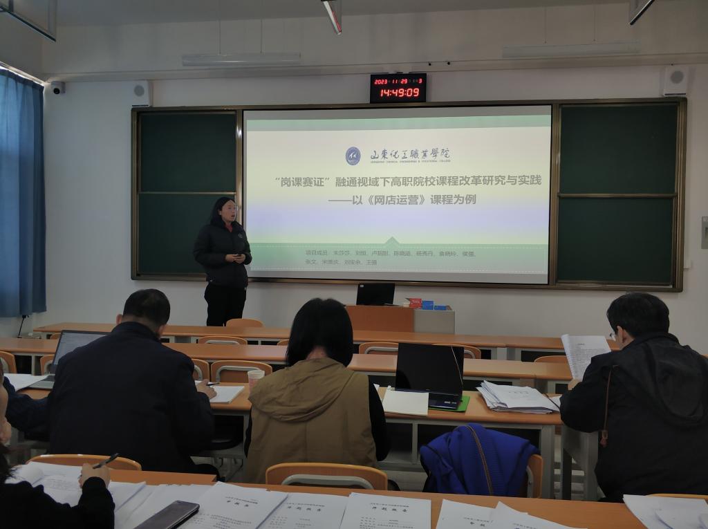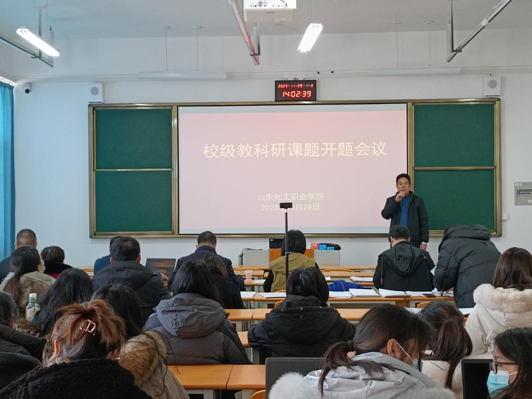 11月29日下午,我校于1101教室举行2023年山东化工职业学院教科研课题开题评审会议,会议邀请了潍坊职业学院鞠桂芹、巨荣峰教授以及我校沈威、吴宁霞、宋美庆、范振河、古平老师担任评委,对今年立项的16项课题进行开题评审。会议由教务科研处处长王剑波主持,各课题组成员、各二级学院教师代表及教务科研处相关人员到场参会。