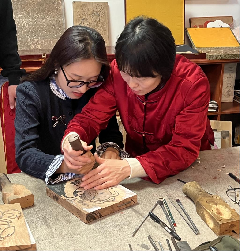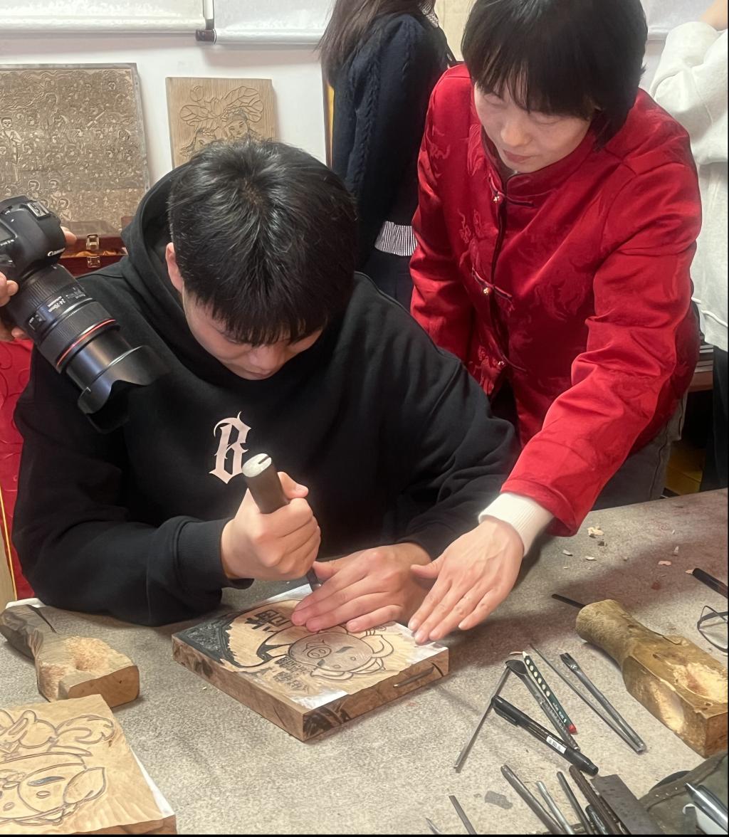 同学们首先参观了杨家埠木板年画制作工序,观摩学习画线稿、梨木板雕刻主线版、印主线稿、刻出色版,套色印刷,修版装裱等工艺。在杨乃东大师的指导下,学生们又动手进行实操雕刻,真实地体会到雕刻的不易与辛苦。杨乃东大师说:“作为传承人,我一直坚定地保留传统技艺,是为了将这项技艺传承、发展下去,让更多人了解这项技艺。”他对木版年画的传承坚持也深深感染着在场的每一位学生,感受到杨大师身上中国匠人的爱岗敬业、精益求精、勇于创新、耐心专注的重要精神品质,激励学生们担起传承中华优秀传统文化的责任。