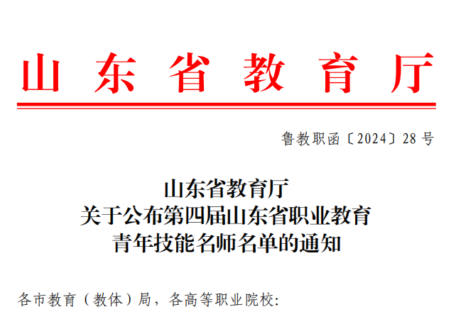 近日,山东省教育厅发布了《关于公布第四届山东省职业教育青年技能名师名单的通知 》(鲁教职函〔2024〕28号),我校葛彩霞老师被认定为第四届山东省职业教育青年技能名师。