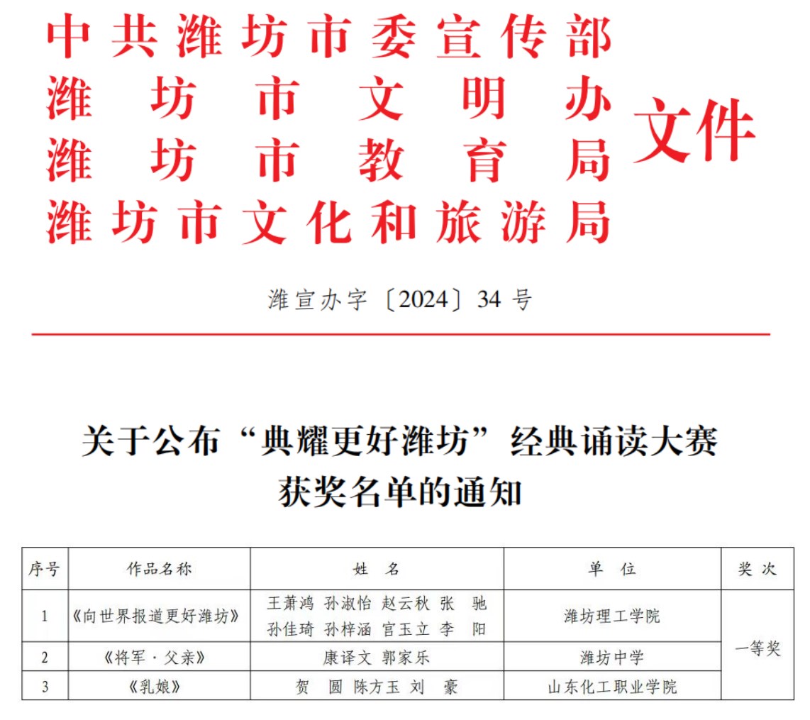 近日,由中共潍坊市委宣传部、潍坊市文明办、教育局、文化和旅游局联合举办的“典耀更好潍坊”经典诵读大赛公布获奖结果,我校基础教学部指导的学生作品《乳娘》喜获一等奖。