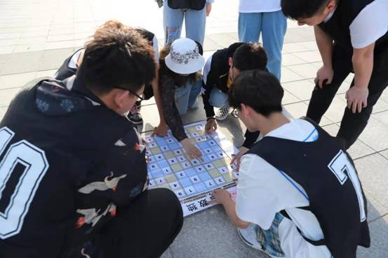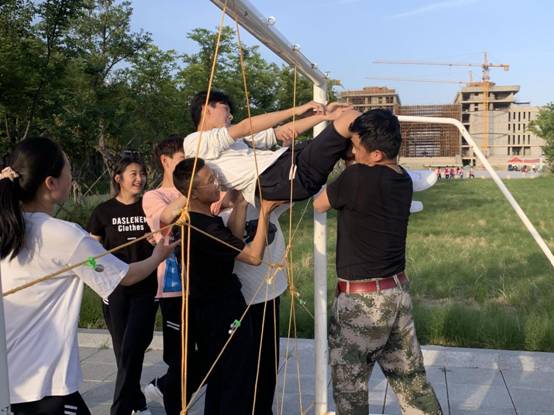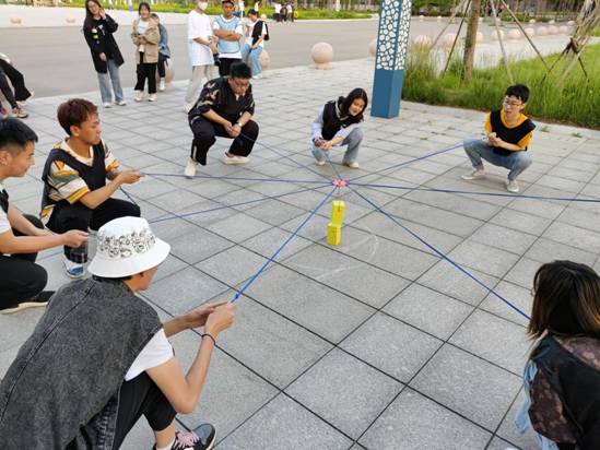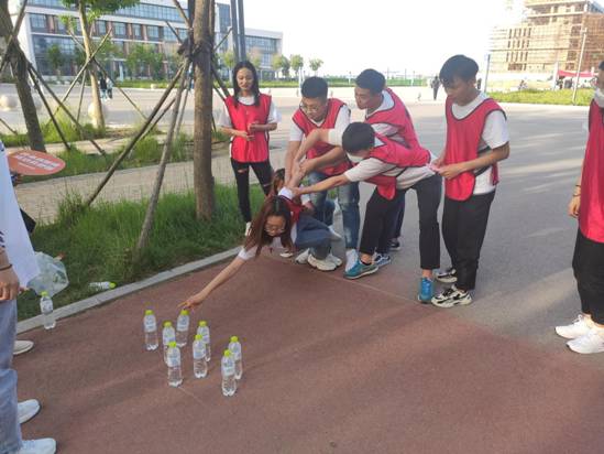 在团队合作闯关活动中,各二级学院派出1位老师和7名同学组成参赛队伍进行比赛。