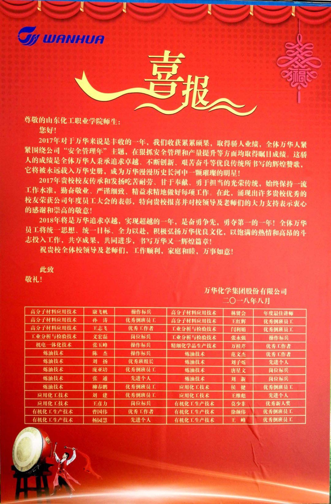 秋意浓浓,喜讯连连。万华化学集团有限公司传来喜报,化学工程系42名优秀校友在工作期间表现优异,贡献突出,获得万华化学集团有限公司的荣誉表彰。