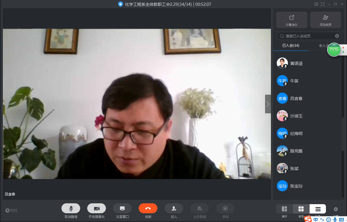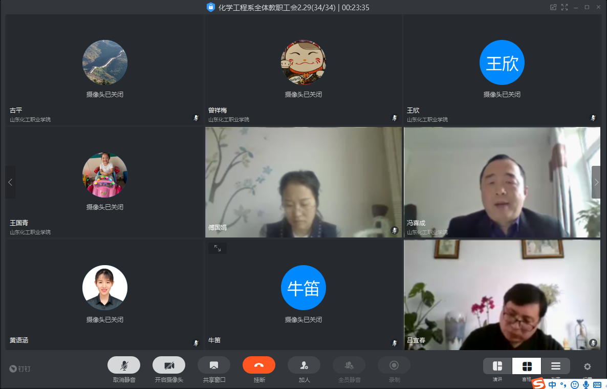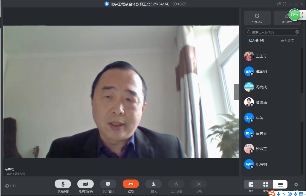 疫情防控特殊时期,为落实教育部、省教育厅有关停课不停教、停课不停学的文件精神和学院教学工作会议要求,2020年2月29日下午15时,化学工程系召开全体教职工视频会议,对寒假期间相关工作进行总结,并且对新学期疫情期间的线上教学和学生管理等工作进一步提出要求。本次会议由党支部书记宋美庆主持,冯喜成主任、吕宜春副主任、黄语涵副书记及全体教职工参加。