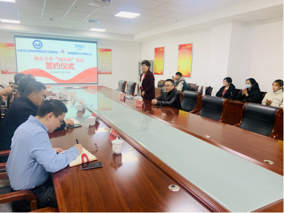 2020年11月19日下午,山东化工职业学院化学工程学院再一次迎来了校企合作的新篇章。淄博鑫泰石化有限公司(下称:鑫泰石化)与我院的校企合作“冠名班”协议签约仪式在2号楼会议室隆重举行。仪式由化学工程学院院长助理葛彩霞主持,化学工程学院党支部书记宋学礼,山东化工职业学院生就业工作处副处长、校企合作办公室主任连晓亮,化学工程学院副院长吕宜春,化学工程学院党支部副书记王恒磊,淄博鑫泰石化有限公司人力资源总监孙金成,淄博鑫泰石化有限公司人力资源部长崔连红等出席了签约仪式。