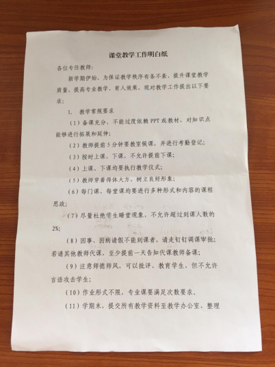 新学期伊始,为保证教学秩序有条不紊,提升课堂教学质量,提高课堂教学效果,化学工程学院要求各位专任教师教学工作遵循标准化、规范化、精细化、个性化四个要求,同时下发了课堂教学工作明白纸,要求专任教师务必遵照课堂教学的最基本的12条常规要求上课,并进行了承诺签字。