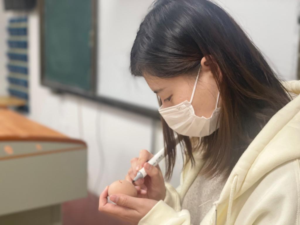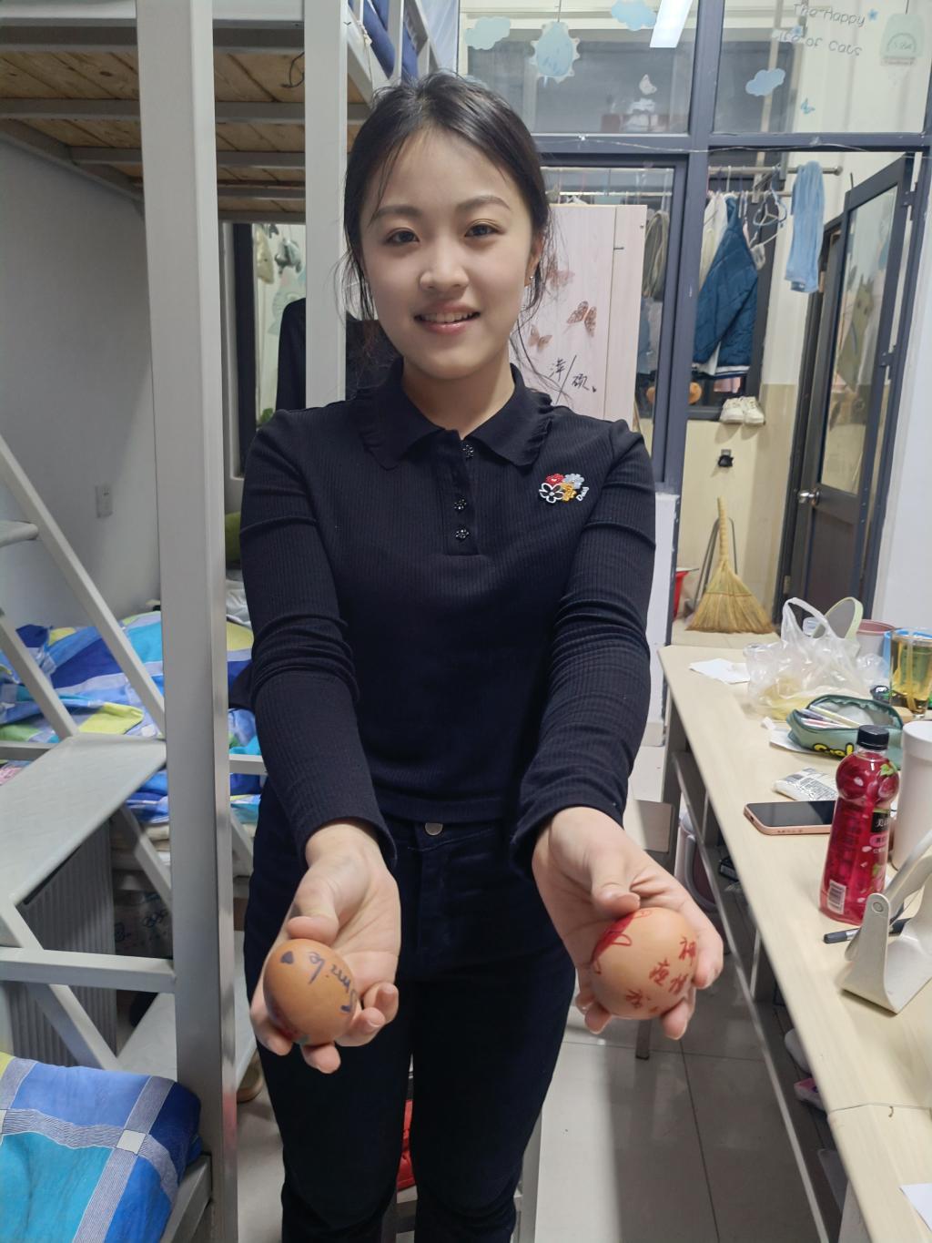 在此过程中,同学们和教师们面对数千枚鸡蛋都丝毫不退缩。虽然画迹笨拙但都小心翼翼地去呵护这一份心意,尽管几个小小的鸡蛋,但在这里面蕴含了学校对学生们十分浓厚的关怀。同时,老师们考虑到疫情防控又不辞辛劳,同时联合本学院的志愿者把鸡蛋亲自送到每个学生的手中并再三确认不遗漏任何一个学生。送鸡蛋时,老师们亲切的叮嘱、暖心的问候都使同学们的心暖了又暖,热了又热。