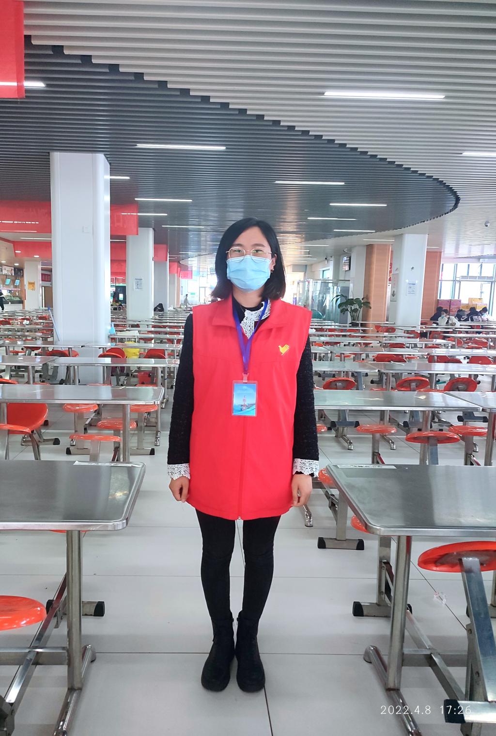 就餐时间,“红马甲”各就各位来到餐厅的各个角落。有的在餐厅入口维持秩序,有的在餐厅里提醒师生就餐间隔一米距离,单方向朝南就餐,有的在提醒学生带好口罩。有的在地下负一引导师生从餐厅南门离开餐厅。