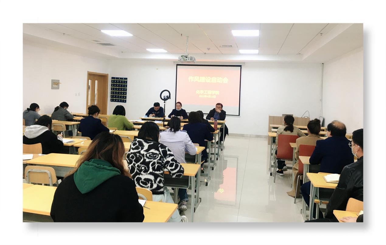 为进一步提振全院工作作风,弘扬干事创业的新风正气,激发干事创业的内生潜能,2022年4月13日下午,化学工程学院通过线上、线下相结合方式,在2308组织召开了大力倡树“严真细实快”工作作风启动会。会议由化学工程学院党总支副书记王恒磊同志主持,学院全体教职工参加。