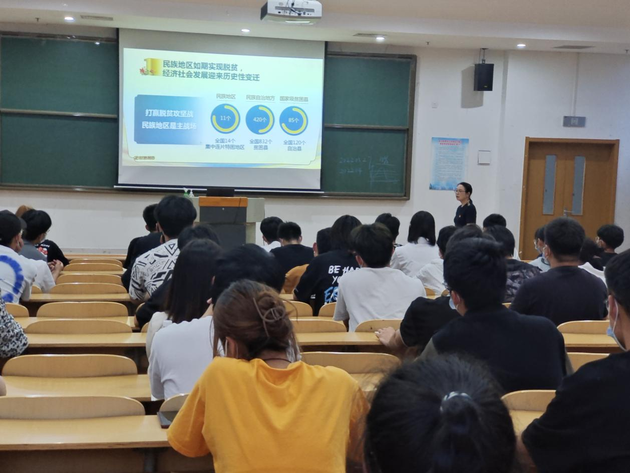 葛彩霞同志从团结之源、变化之巨、长远之治三个方面介绍,从邦畿千里、惟民为止各民族开拓疆域到秦朝南海郡、桂林郡到清代明代的改土归流,从协同内外、天下一家到百川异源、皆归于海、人心所向、惟道与义,讲述了昭君出塞、凉州会盟、瓦氏夫人抗倭、锡伯族万里戍边的历史佳话。从梁启超《中国历史上民族之研究》中的断言“中华民族为一极复杂而极巩固之民族;此复杂巩固之民族,乃出极大之代价所构成;此民族在将来,绝不至衰落,而且有更扩大之可能性。”讲到习近平总书记“要见微知著,增强忧患意识,提高战略思维,有效防范民族工作领域的各种风险隐患,切实筑牢祖国北疆安全稳定屏障”的殷殷嘱托。从打赢脱贫攻坚到全面建成小康社会一个都不能少,诠释了各族人民手足相亲、守望相助,像石榴籽一样紧紧拥抱在一起,葛书记谈到了化学工程学院的凝聚力建设,包容其他民族同学,并站在同学们的角度,解读党员标准,要求同学们时刻以党员标准要求自己,时刻树立红线意识,积极进取,处处起先进模范带头作用。