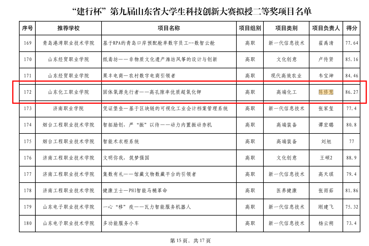 2022年12月21日,由山东省教育厅主办的“建行杯”第九届山东省大学生科技创新大赛圆满落下帷幕。大赛决赛在山东农业大学举行,因疫情原因,来自全省本科、高职60余所高校的300个项目汇聚云端,于线上参加比拼。经过激烈的角逐,我校化学工程学院教师陈学惠、王恒磊指导的项目《固体氧源先行者——高孔隙率优质超氧化钾》荣获二等奖,项目负责人为2021级学生陈修慧,团队成员李元龙、姜大炜、李坤,该项荣誉刷新了学校在此赛项的获奖记录。
