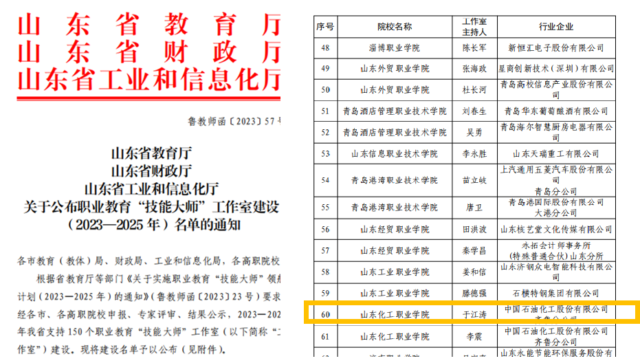 近日,山东省教育厅等部门发布《关于公布职业教育“技能大师”工作室建设(2023-2025年)的通知》(鲁教师函[2023]57号),我院联合中国石油化工股份有限公司齐鲁分公司推荐的于江涛“技能大师”工作室入选山东省职业教育“技能大师”工作室建设名单。