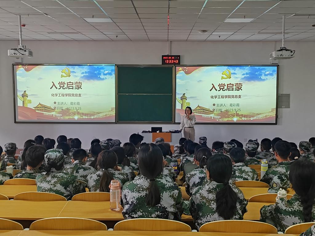 为切实做好2023级新生入党启蒙教育工作,上好入党启蒙“第一课”,增进大一新生对党组织的认识和了解,提高学生思想觉悟和政治素养,9月25日,化学工程学院党总支副书记葛彩霞带领学院优秀党员教师代表,分专业、分班级对2023级全体新生进行了入党启蒙教育工作。