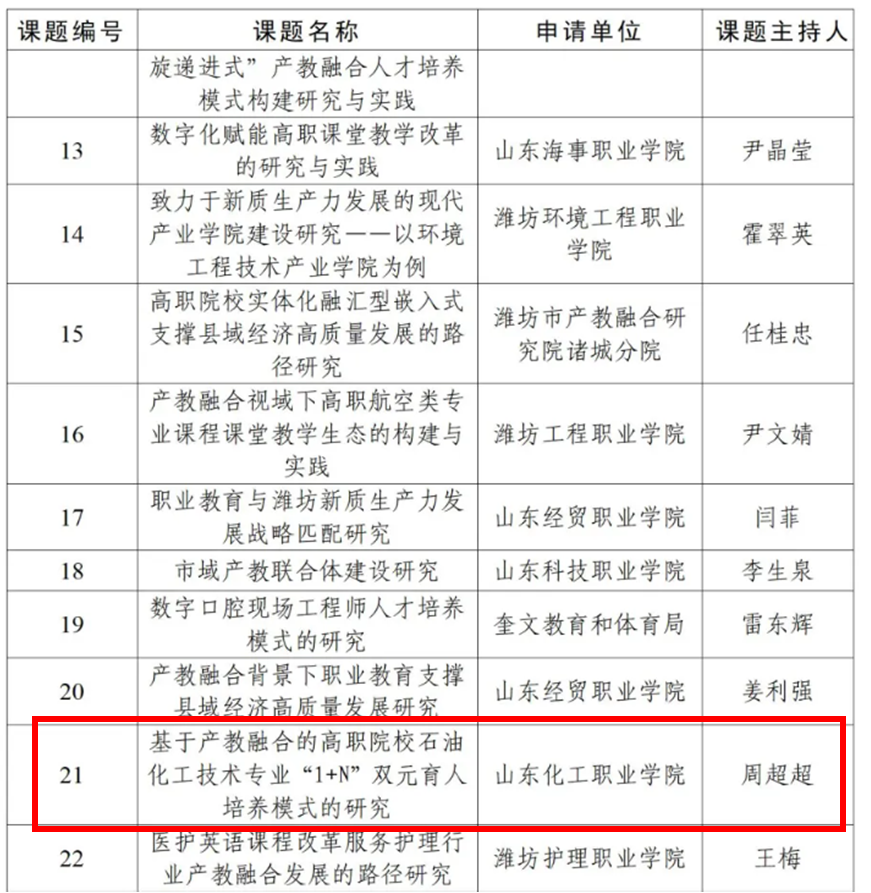 近日,潍坊市产教融合研究院公布了2024年度产教融合重点课题立项名单,我校化学工程学院周超超教师、宋明凤教师主持的2项课题获批立项。