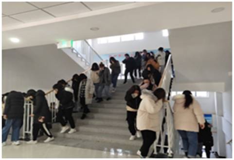 本次演练分为教学楼疏散演练和宿舍疏散演练两阶段。当天下午13时40分,随着一声哨响,教学楼疏散演练开始。同学们有的用衣袖,有的用衣角掩住口鼻,头部放低、重心下移,靠右贴着墙有序撤出教室向楼下疏散。整个过程紧张而有序,脚步声急促但不慌乱,所有人沿着预定路线快速撤离。虽然在个别楼梯拐角处发生短暂拥堵现象,但整个教学楼疏散演练过程没有发生任何事故,1200多人仅用时两分钟就完成教学区域安全撤离任务。经集合点负责人核查,师生全部集合到位。