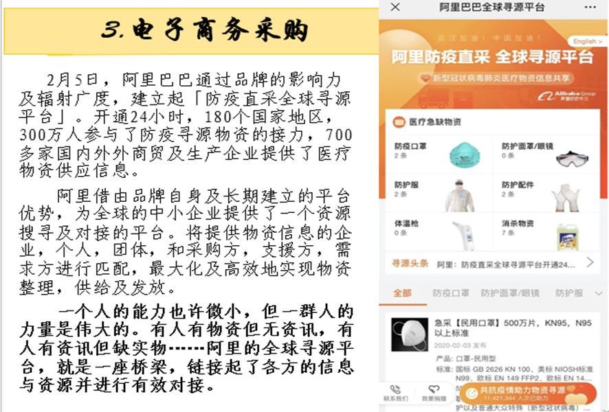 采购管理课程教师袁晓玲在讲解现代物流采购的发展趋势时,指出新冠肺炎病毒造成口罩采购空前困难,引入阿里防疫直采,全球寻缘平台案例。案例中阿里借助自身品牌及长期建立的平台优势,为全球中小企业提供了一个资源搜寻及对接的电子商务采购平台,更显企业爱国情怀,助力抗疫,让学生感受到现代企业的社会责任感。