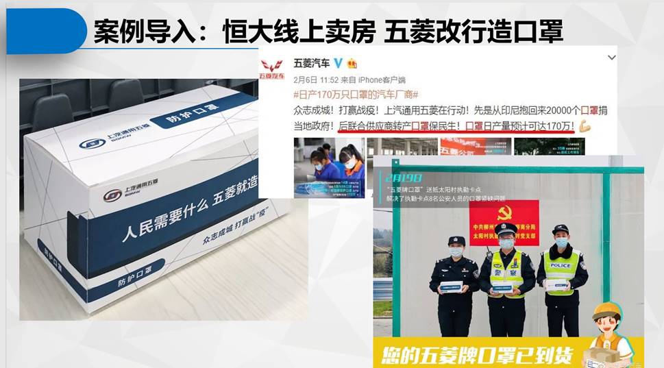 市场营销基础课教师朱彬彬在市场营销环境分析中,加入疫情期间的全新案例“口罩生产商——五菱汽车”和“恒大名都线上卖房”,引导学生在疫情防控期间感受五菱汽车“人民需要什么,五菱就造什么”的情怀的同时,也让学生认识到企业营销宏观环境是不可控的,适者才能生存。营销人员既要认识到威胁又要抓住机遇,通过营销努力来适应并降低宏观环境的影响。