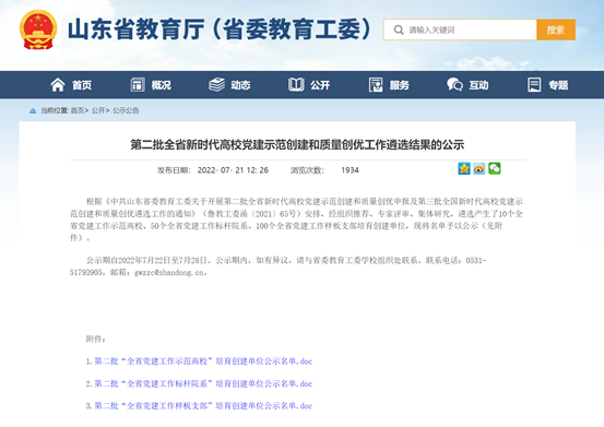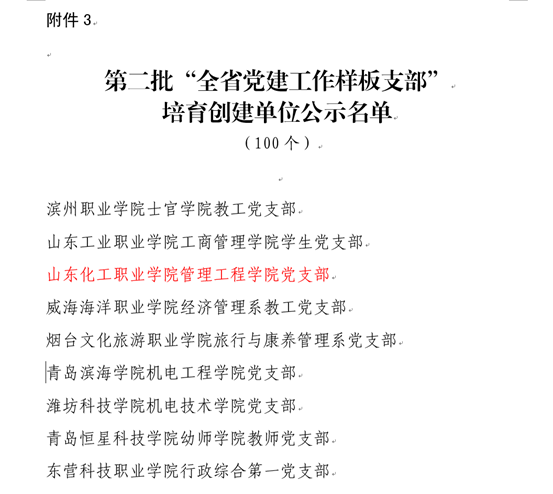 根据《中共山东省委教育工委关于开展第二批全省新时代高校党建示范创建和质量创优申报及第三批全国新时代高校党建示范创建和质量创优遴选工作的通知》安排,经组织推荐、专家评审、集体研究,遴选产生了10个全省党建工作示范高校、50个全省党建工作标杆院系、100个全省党建工作样板支部培育创建单位。我院管理工程学院党支部获批“全省党建工作样板支部”。
