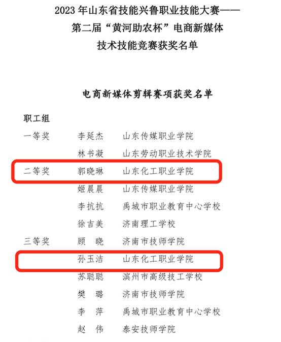 11月14日,2023山东省“技能兴鲁”职业技能大赛第二届“黄河助农杯”电商新媒体技术技能竞赛决赛在山东传媒职业学院圆满落幕,在来自全省二十多所高职和技师院校的二百余名选手中,我校管理工程学院郭晓琳老师、孙玉洁老师分别获得大赛二等奖、三等奖的好成绩。