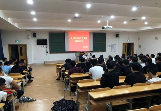 2018年9月19日下午18点30分,在六号阶梯教室机电工程系组织召开了2017级学生学分制改革及教学改革解读大会。机电工程系主任彭爱玲、机电工程系党支部副书记孙亚茹、辅导员老师及2017级全体学生参加了大会。