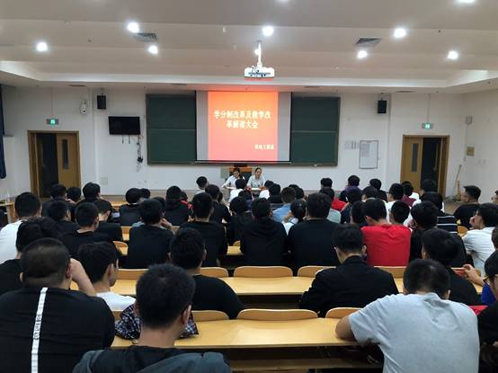 2018年9月19日下午18点30分,在六号阶梯教室机电工程系组织召开了2017级学生学分制改革及教学改革解读大会。机电工程系主任彭爱玲、机电工程系党支部副书记孙亚茹、辅导员老师及2017级全体学生参加了大会。