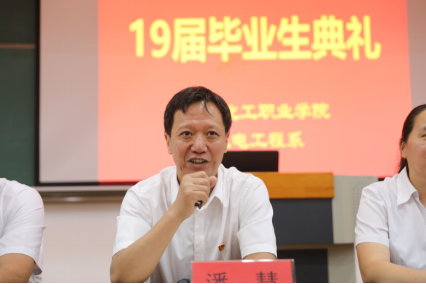 典礼进行到第五项议程,范振河老师代表机电工程系全体教师进行发言,他用真诚的话语道出了对孩子们的不舍和满满的祝福,他讲到“三年前,你们还是稚嫩的孩童,肩膀背着重重的行囊,怀揣着美美的梦想迈进了山东化工职业学院的大门,三年后的今天,经过岁月的洗礼,你们已经华丽转身,走向成熟,迈向社会,奔上自己的人生之路。”范老师的发言阐述了全体老师的心声,也为2019届毕业生送去了满满的祝福。